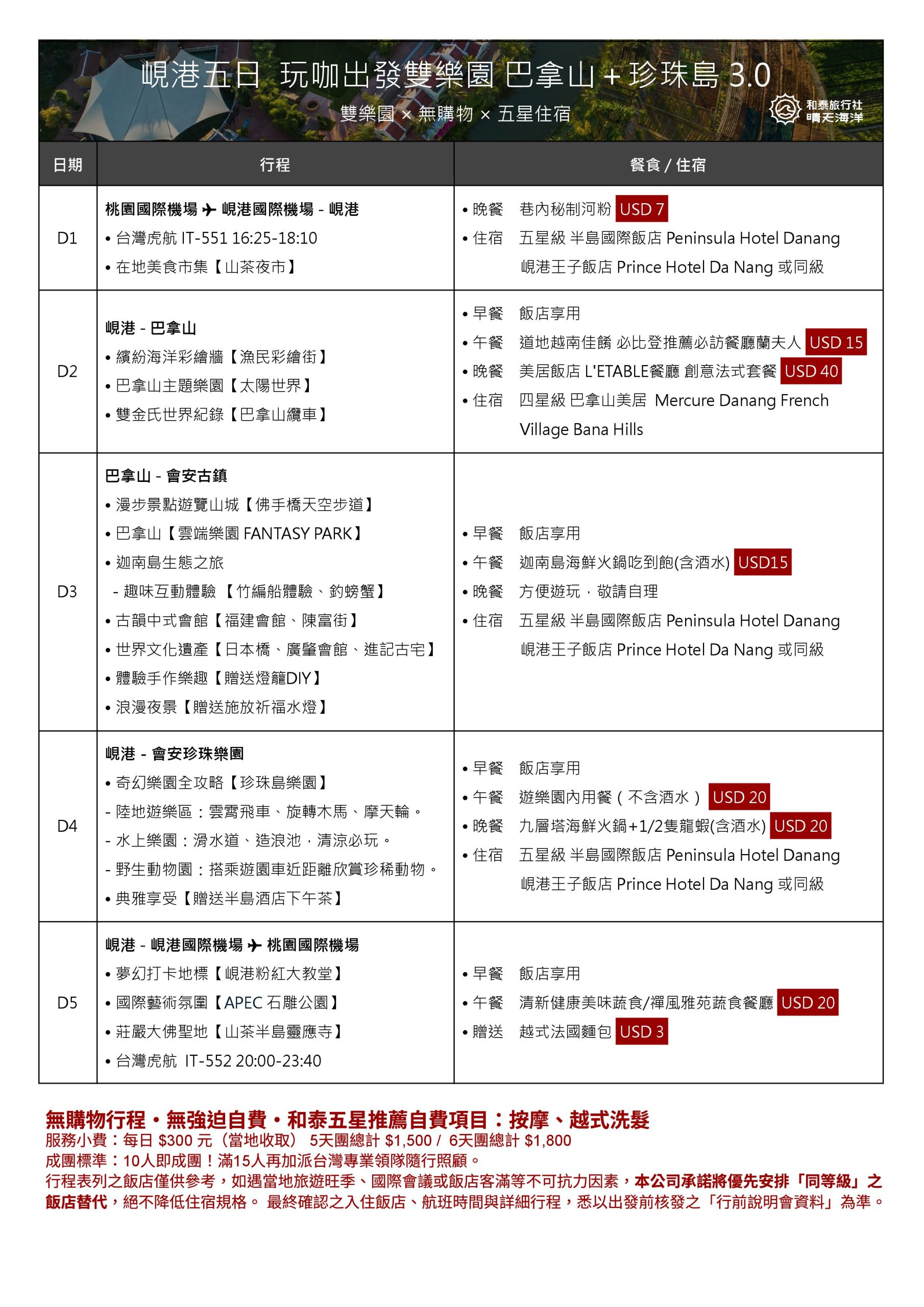 《越南峴港5日》五星團 玩咖出發雙樂園|巴拿山x珍珠島x雙樂園x無購物x五星住宿